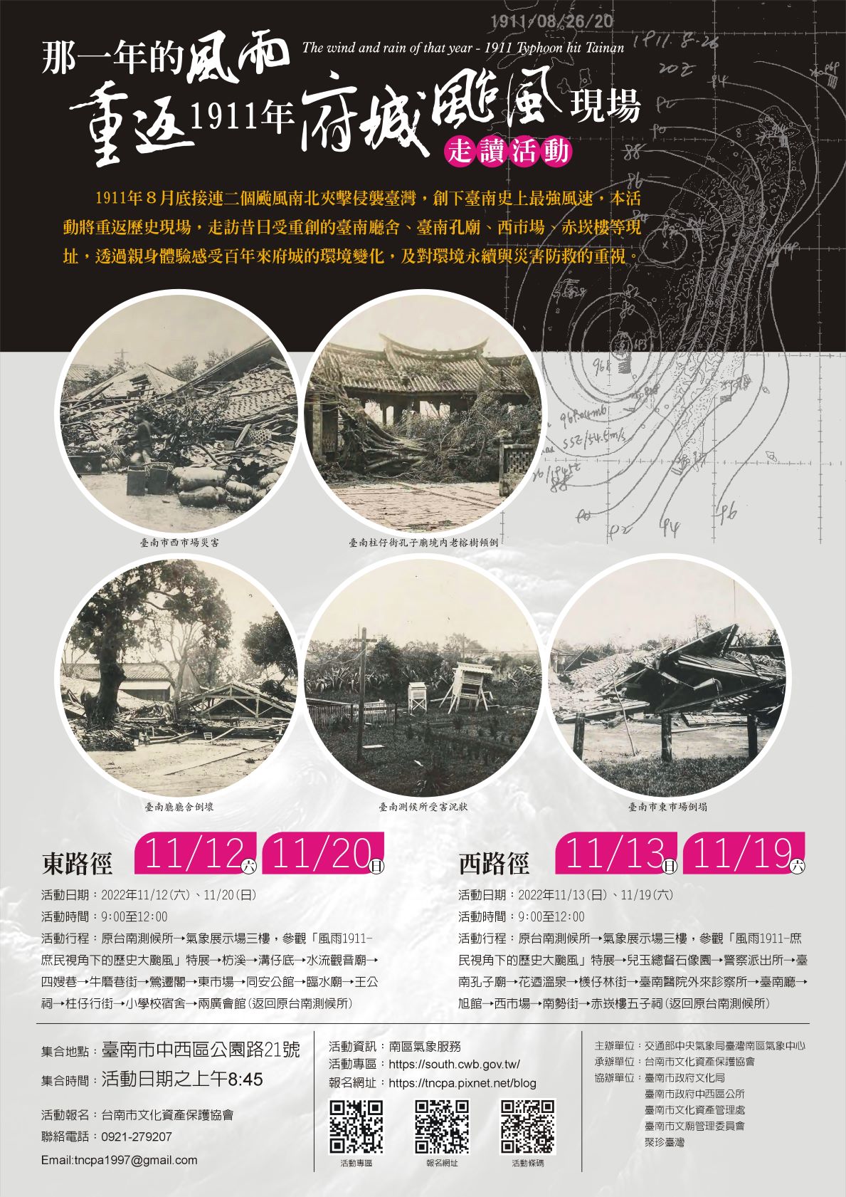 一、宗旨: 1911年8月底接連2個颱風,南北夾擊侵襲臺灣,創下臺南史上最強風速,本活動將帶領民眾重返歷史場景,走訪昔日曾重創的臺南廳舍、臺南孔子廟、西市場及赤崁樓等場址,讓民眾透過親身體驗,感受百年來府城的環境變遷,藉以啟發民眾對氣候變遷議題的關注及興趣,深化氣候變遷素養及對環境永續及災害防治的重視,並期望透過與臺南在地生活的實質連結,達到多元氣象防災推廣目的。 二、活動時間: 111年11月12日(星期六)、13日(星期日)、19日(星期六)、20日(星期日),每日上午9至12時,共辦理4場次。 三、活動場次資訊: